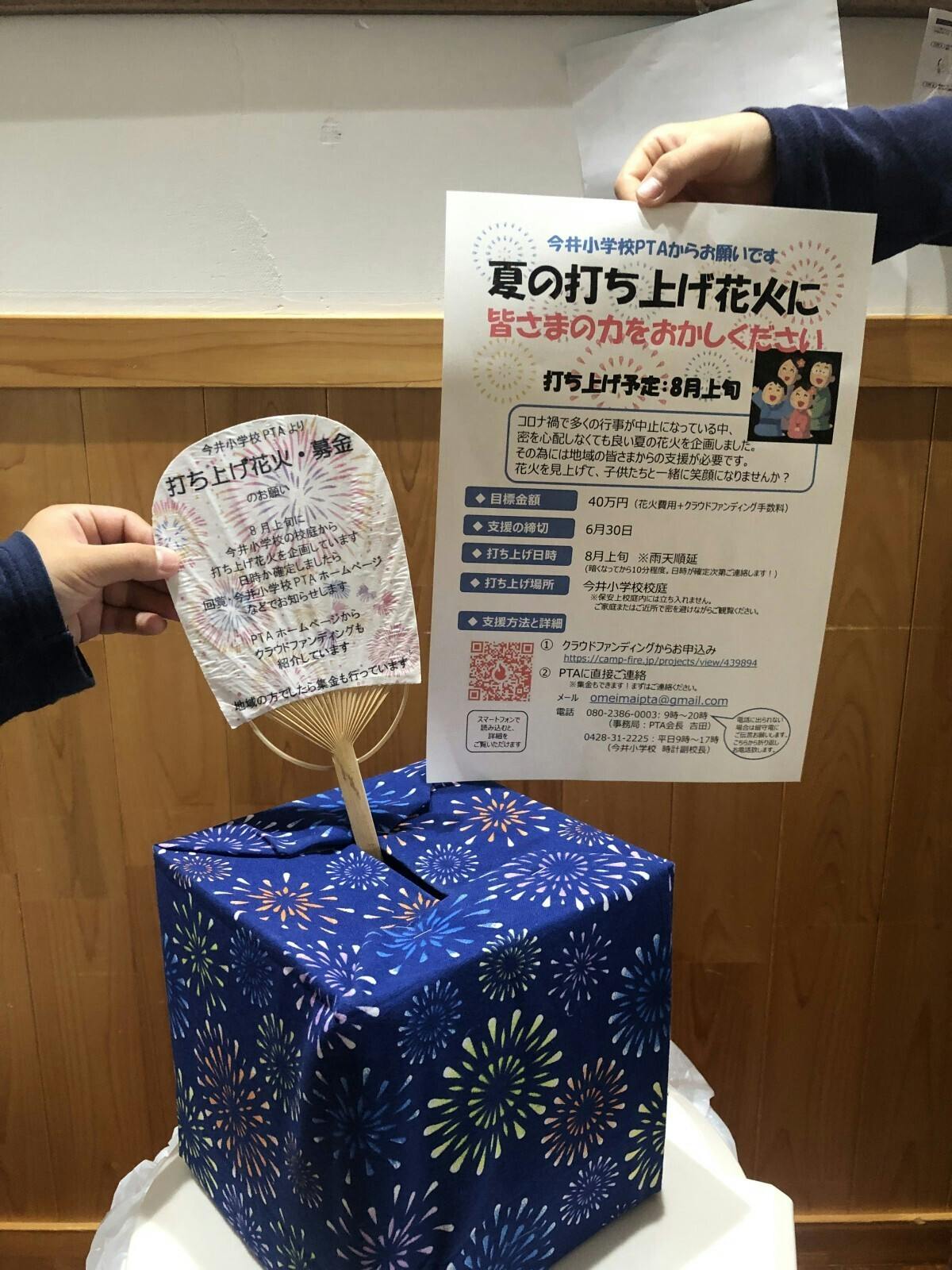 これは、七日市場交差点近くにある、ヘアーサロンクジライさんに置かせていただいている、今井小PTA夏の花火企画の募金箱です!