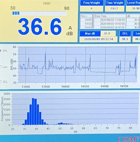 ノイズのレベルは実測値で36.6dB 設計保証でも45dBの低ノイズ性能を実現しました。 50dB以下のノイズですのでレベル的には小さな声程度の音です。歯磨きをしながらでも、TVを観たり、音楽を聴いたりも問題ないレベルのノイズです。
