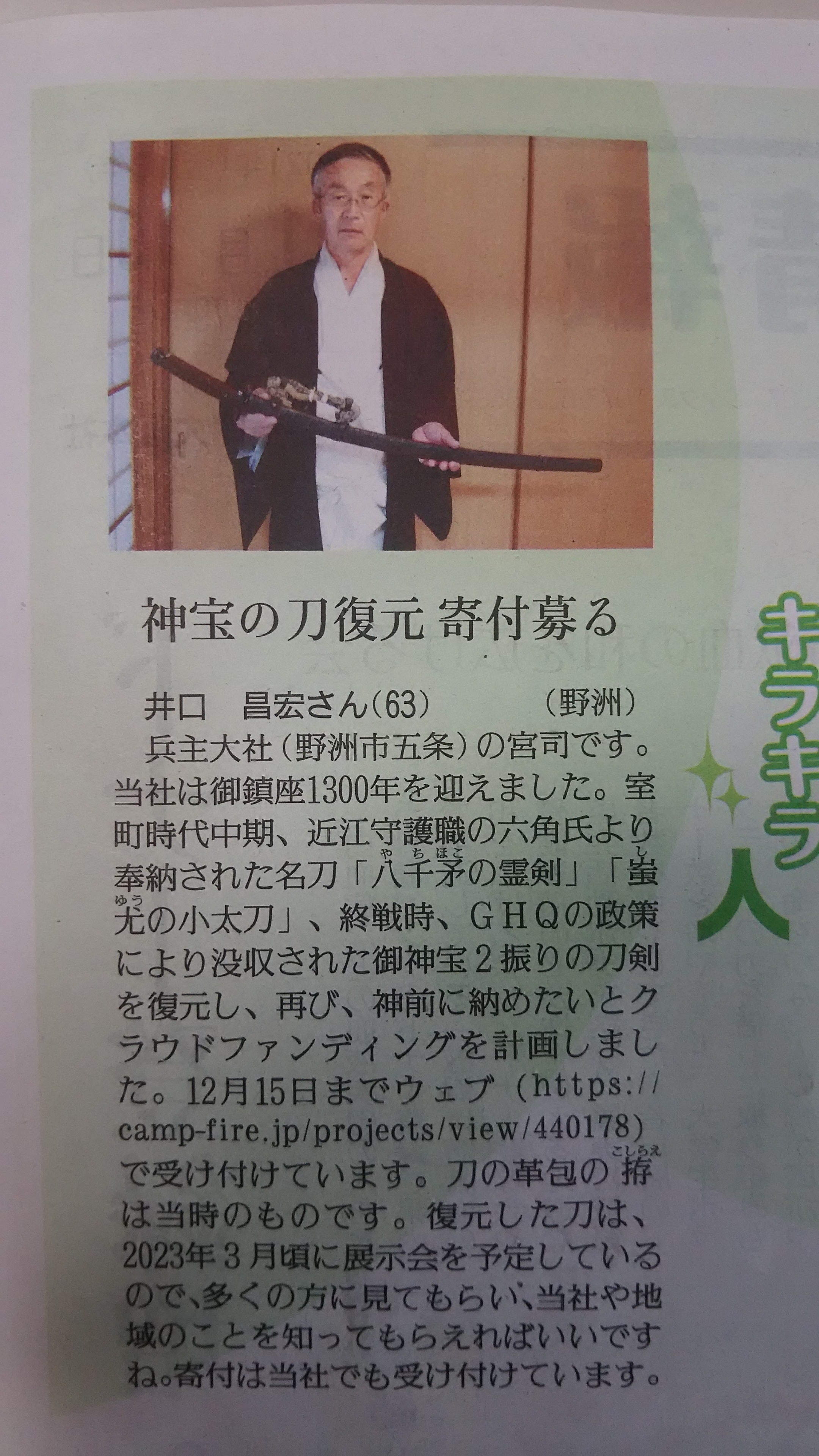 先日の目標金額達成以後も、皆さまからの温かいご支援をいただいております。本日は、読売新聞のしが県民情報の「キラキラ人」のコーナーで、刀剣復元プロジェクトを紹介していただきました。残り一ヶ月足らずとなりましたが、引き続きお見守りくださいますようお願い申し上げます。