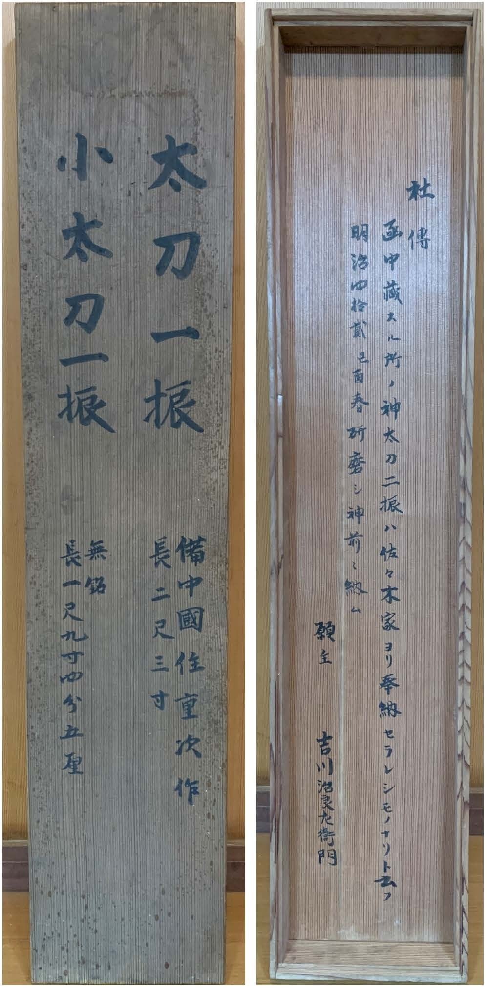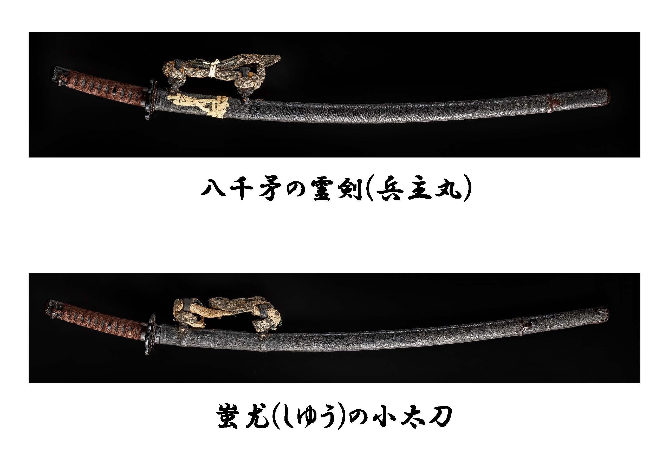 今回復元する2振りの太刀と小太刀はともに、室町時代中期(550年前)近江守護職の六角氏又は守護代の伊庭貞隆より奉納された名刀です。1振りは鎌倉時代中期(800年前)の備中 古青江派の重次の太刀、1振りは無銘ながら太刀姿の小太刀です。約80年前の終戦時にGHQの政策により没収され失われた当社の最も大事な御神宝です。古くは御神体と共に本殿内に納められており、神事の際には威儀物として用いられていたことが記録にも残っております。また、室町時代の革包の拵(こしらえ)や刀の納められていた箱は現存しており、そこから刀身の寸法などもわかっております。
