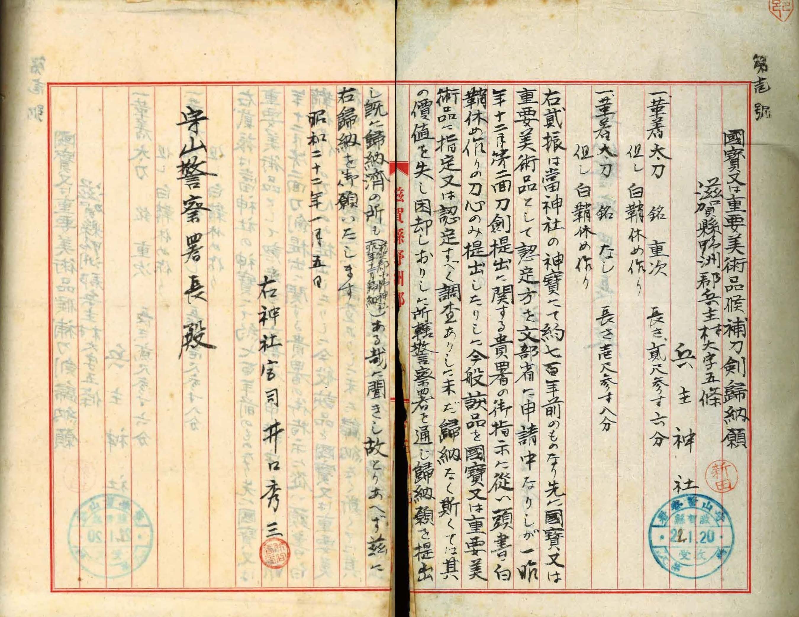 また、昭和22年(1945)には当社の先々代の宮司が警察署宛に返還の嘆願書を提出した記録が残っておりますが、残念ながら返還されることなく現在に至っております。