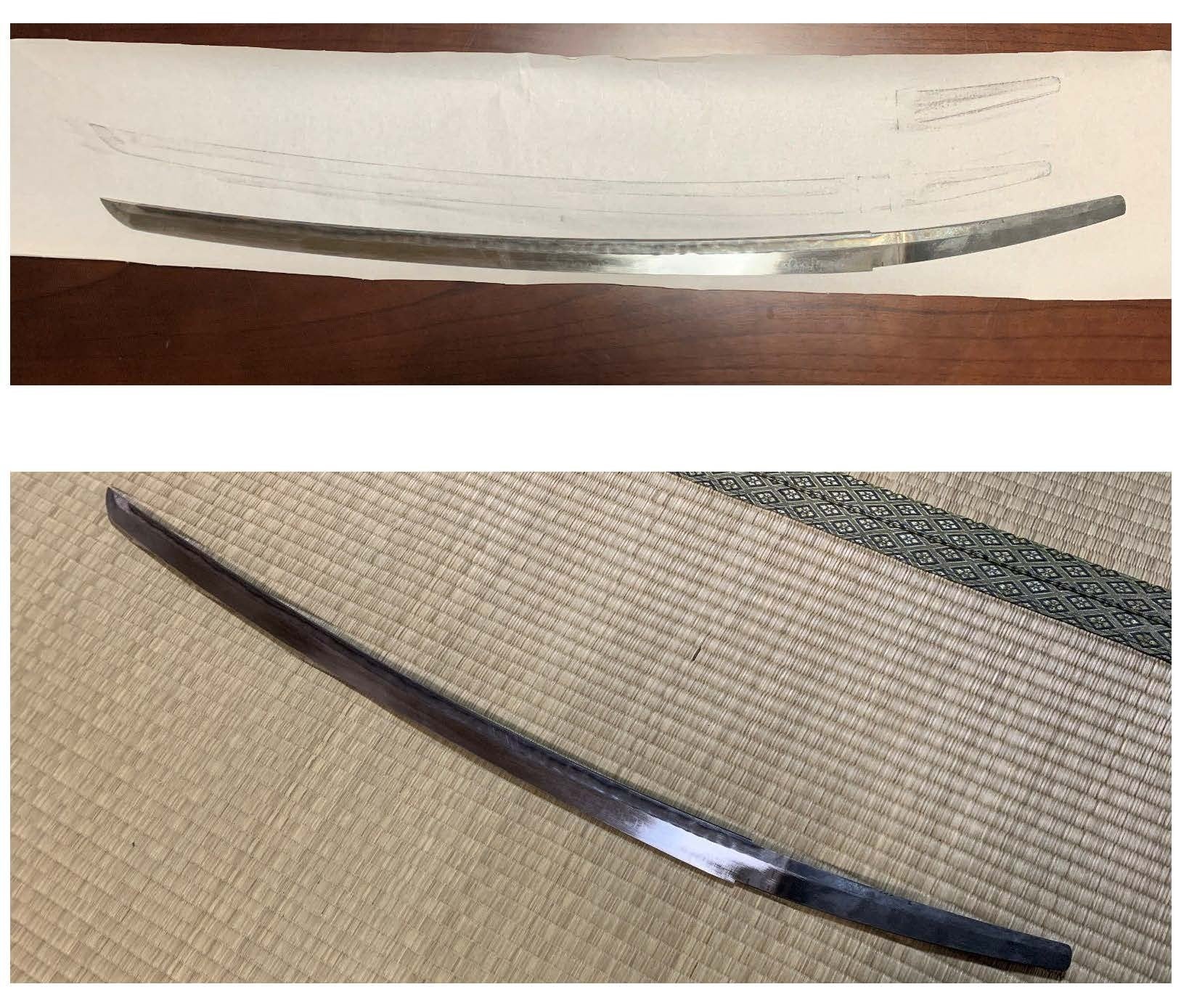 今回作刀いただくにあたり、1振目の八千矛の霊剣は銘が判明しておりますので 備中国 青江重次の写しにて作刀いただき、2振目の蚩尤の小太刀は寸法は判明しておりますが無銘ということで、北川氏の最も得意とされております福岡一文字にて作刀いただきます。