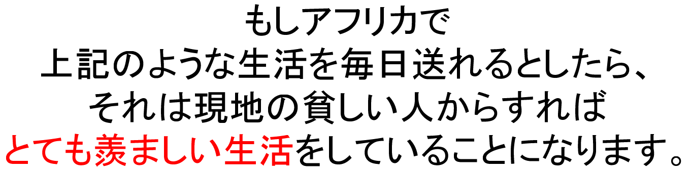 あなたは毎日、自分の家の床の上で寝れますか?汚いし硬いから寝たくないですか?毎日ぬるい水道水しか飲めない生活はどうでしょう?味が無いし冷たくないから嫌ですか?毎日冷たいシャワーを浴びるのは嫌ですか?使い古したボールだけで1年間遊び続けられますか?