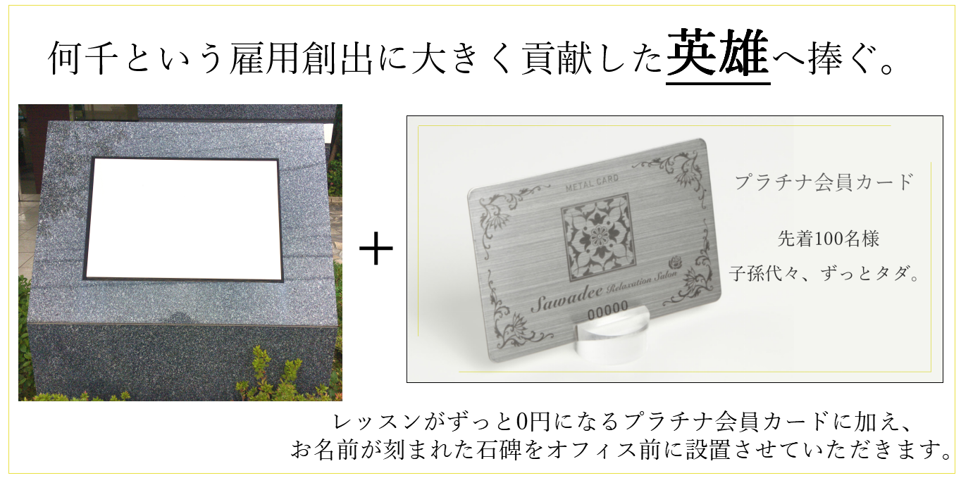 【先着50名様クラウドファンディング限定】で本レッスンがずっと0円で受け放題になる ⑴の会員カードに加え、数千・数万の雇用創出を助けた英雄としてケニアもしくはルワンダのオフィス前に記念碑を建て、名前を刻まさせていただきます。ご購入者様1名あたり、1人分のお名前を刻まさせていただきます。石碑に刻むご希望のお名前のスペルを必ず英語で、備考欄にご記入下さい。※写真はイメージであり、実際のものとは異なります。