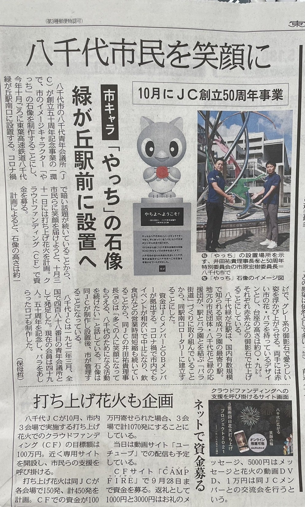 我々の活動について東京新聞に掲載されました!花火の打ち上げに向けて関係各所の皆さま、市内の皆様のご協力を仰ぎながら盛大かつ、安心安全な花火の打ち上げに向けて準備進めております。(打ち上げ場所の決定、消防計画等々の準備も着々と進んできております。)また、沢山の方々に共感頂くために、各所で情報発信をさせていただいております。皆様のご支援で沢山の方々が笑顔になれるよう、心が安らぐように今後も日々準備進めて参りますので思いを共感して頂ければ幸いです。また、ご支援頂きました皆さまありがとうございます。10/31(雨天時11/7)の打ち上げを楽しみにお待ちいただければと思っております。沢山の方々に知って頂くために、このプロジェクトについてを周りの方々へお伝え頂けますと幸いです。どうぞ宜しくお願い致します。
