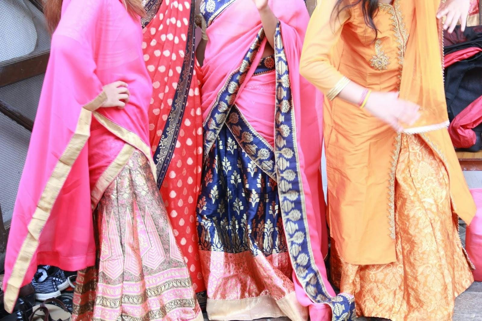 TEEJで女性が着る伝統衣装はサリーと呼ばれていて、インドやネパール等の南アジア地域の伝統衣装です。色は日本の色彩よりもずっと鮮やかで、踊りの上手なネパールの女性が着て踊ると色が映えて豪華に見え、とてもきれいな衣装です。