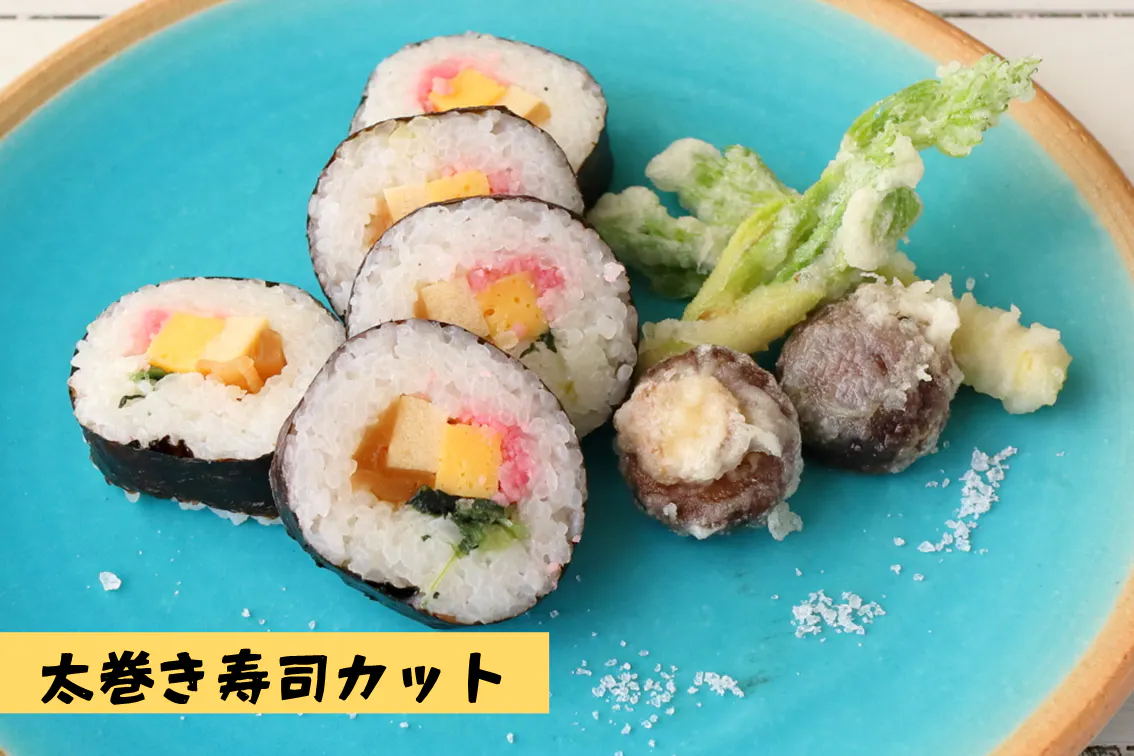ふんわり手巻きタイプの定番の太巻き寿司をカットして凍らせました。カットの手間や崩れの心配はいりません。太巻き寿司の中の具材に、玉子焼き、干瓢、高野豆腐、おぼろ、青菜が入っております。老人保健施設や病院のメニューやビュッフェやバイキングに使っていただく予定でした。