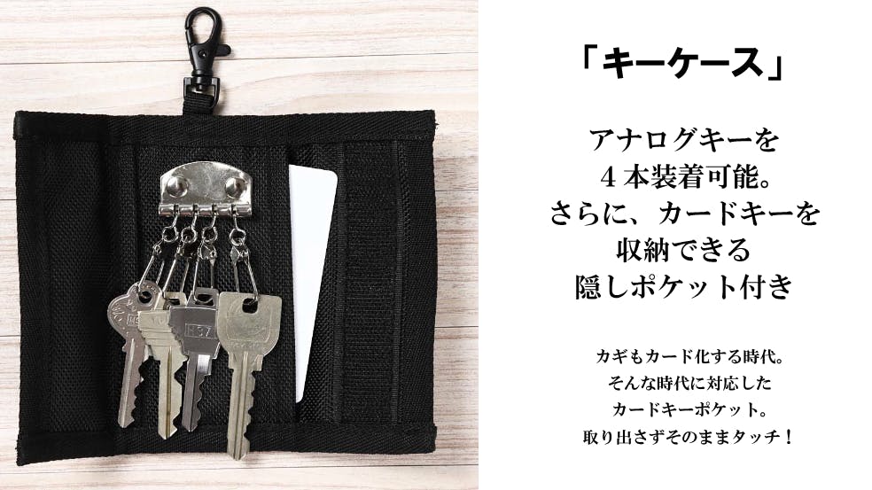 カラビナなどを利用して、標準装備の小物以外のキーフォルダーや財布もお好みで入れ替えることが可能です。カスタマイズする楽しみも広がります。