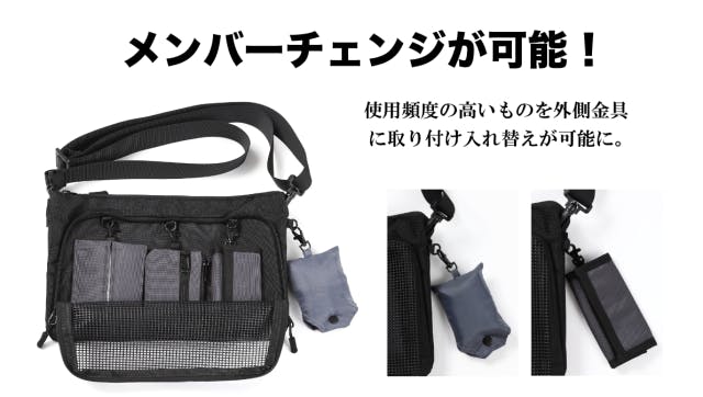 カバン前面のメッシュポケットの内側には、「キーケース」「コインケース」「ティッシュケース」が常時装着できる金具が標準装備されている、あまり見ない「オールインワン」タイプのサコッシュです。
