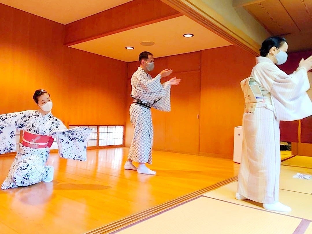 「祭の花笠」 今日で通常のお稽古は最後となりました。次は下ざらい(リハーサル)、そしていよいよ本番がやってきます!楽しい祭のひとときをお客様と共に過ごせるよう、熱さに負けず頑張ります!写真は撮影した稽古動画を確認している3人。手元には…お面?!祭の花笠 皆様どうぞお楽しみに!