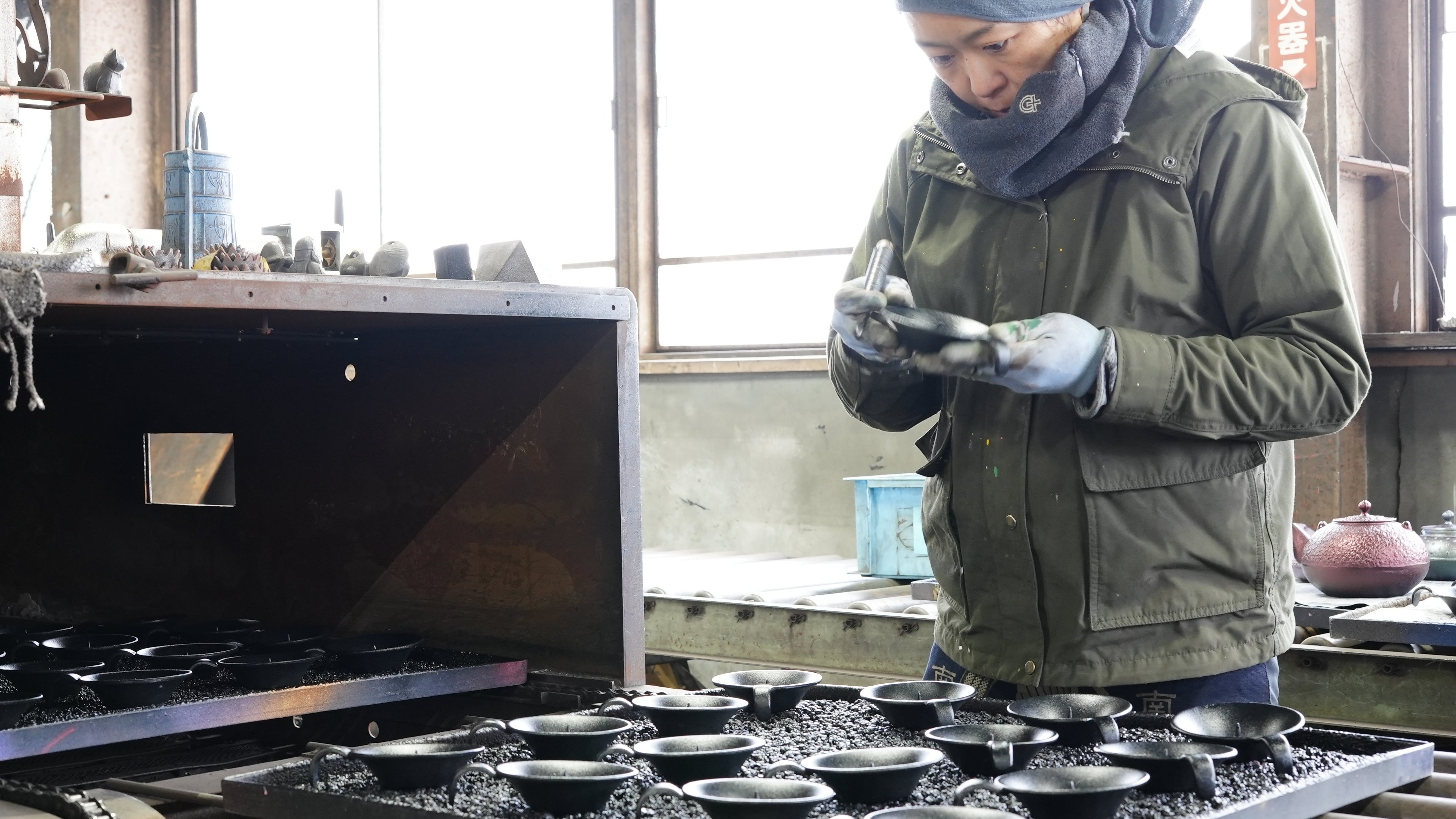サビを防ぐために表面に酸化皮膜をつける「窯焼き」と呼ばれる南部鉄器特有の伝統技法。