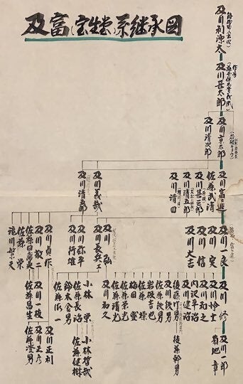 5代目 及川富之進 が作成した継承図私たちは、1848年(嘉永元年)現在の岩手県奥州市水沢羽田地区にて初代 及川利源太により宝生堂として創業しました。