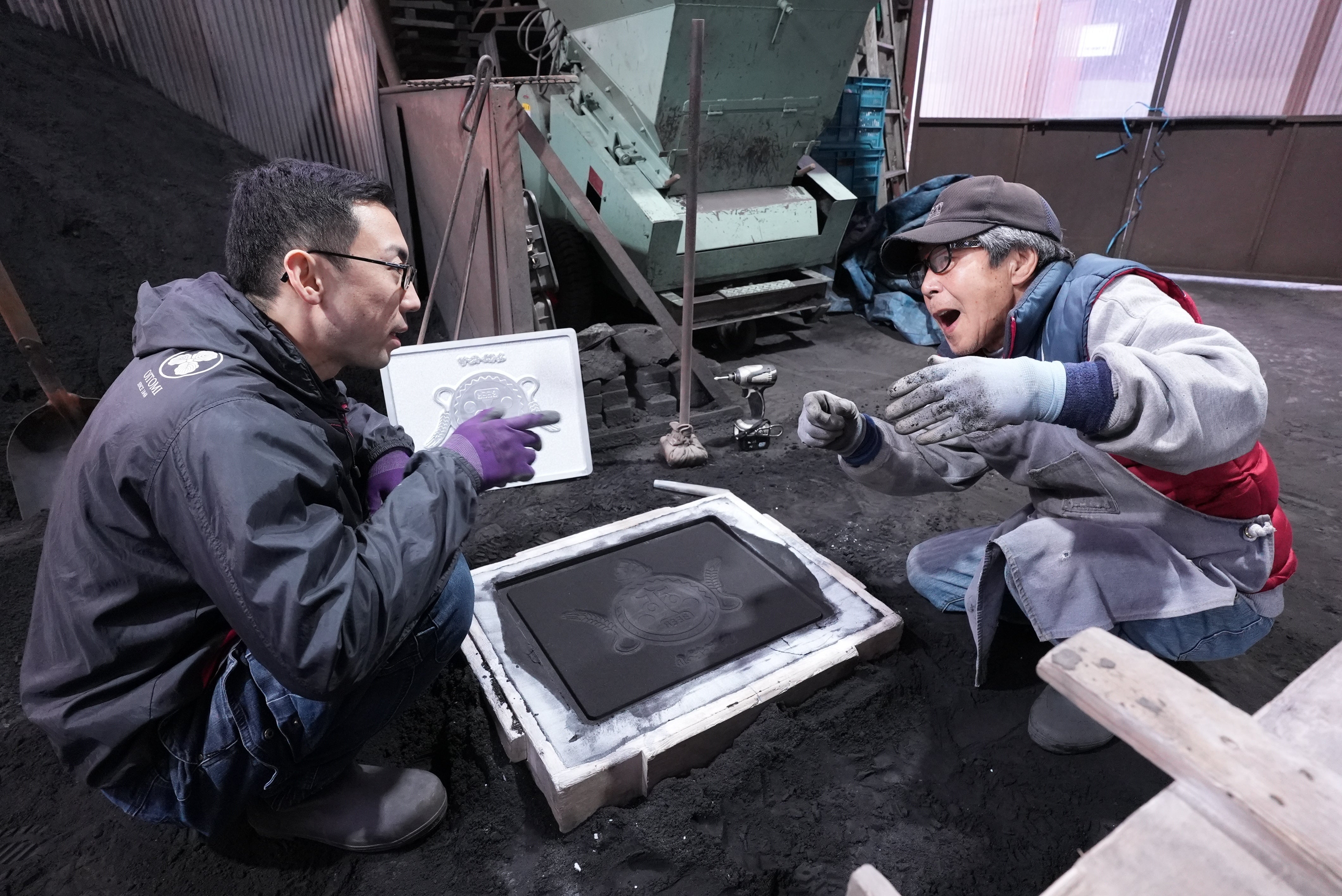 鋳物砂を用いた型の制作にあたる師弟。