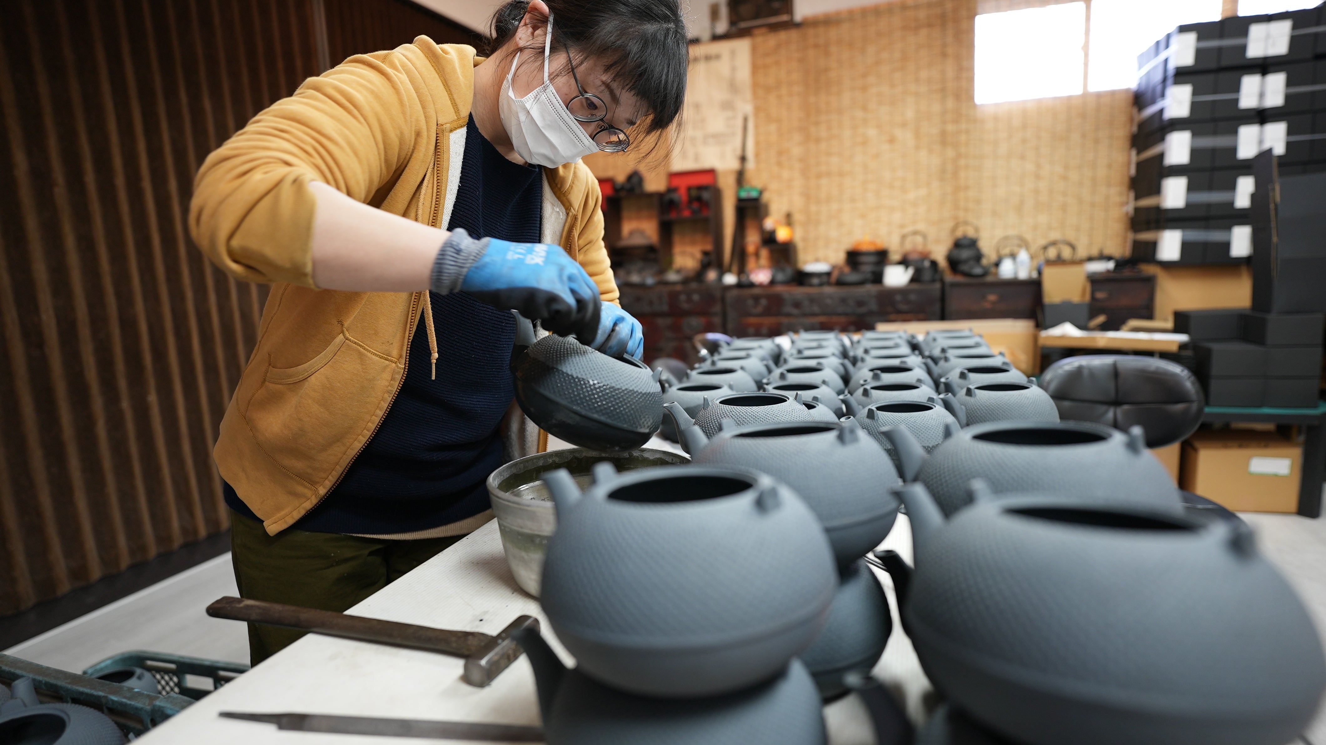 着色、乾燥の終わった鉄器を検品している様子。