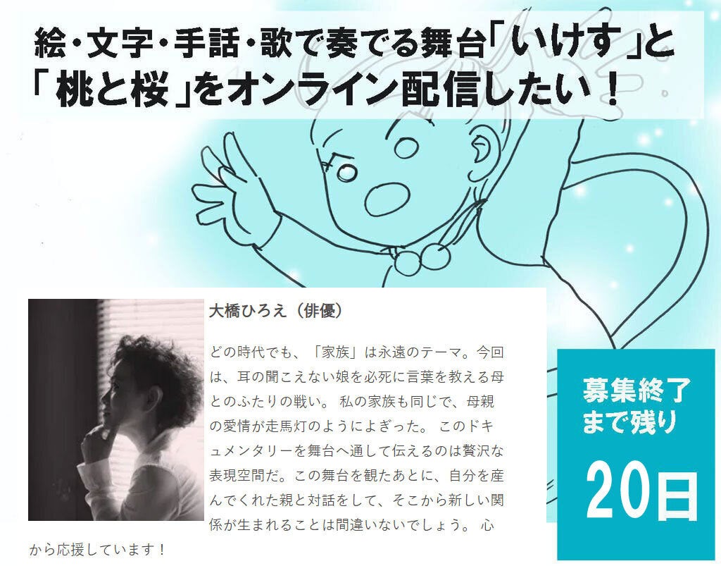 応援コメントをくださった俳優、大橋ひろえさんのことをご紹介させていただきます。彼女は私の永遠のヒーローです。俳優としてまっすぐひたすらに夢に向かって走り続けた彼女。周りはきこえる俳優さんばかりで、彼女はただ一人凛として、舞台の上でそんな差も感じせず、輝いていました。そんな時、私は啓発活動をしていたのですが、人の前でお芝居するというのは考えても見なかったことです。聞こえないから舞台とは疎遠と感じながらも立ち向かうひろえさんの姿は私の心を奪われました。何を隠そう、私も幼い頃は一人芝居をするほど舞台には憧れていましたが、裏方として、美術制作や監督が出来れば。。。と控えめにいきました。絵を描いて、それが表現の一つになれれば。先は何が起きるのかわからない。諦めないで立ち向かう大橋ひろえさんの姿は私にとって永遠のヒーローです!彼女がどこまで行くのか。。。この目で見守りたいです!