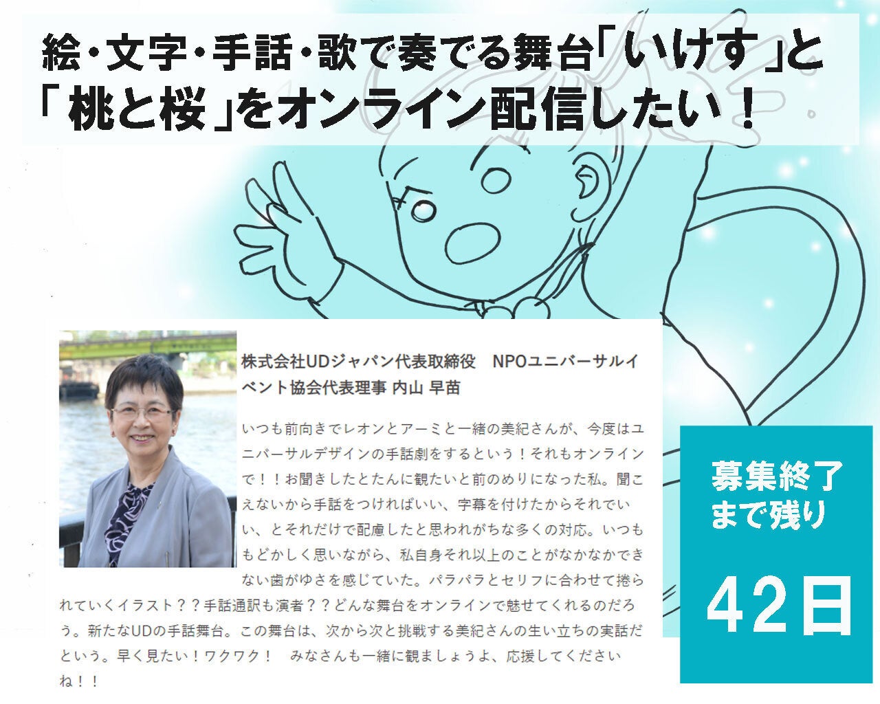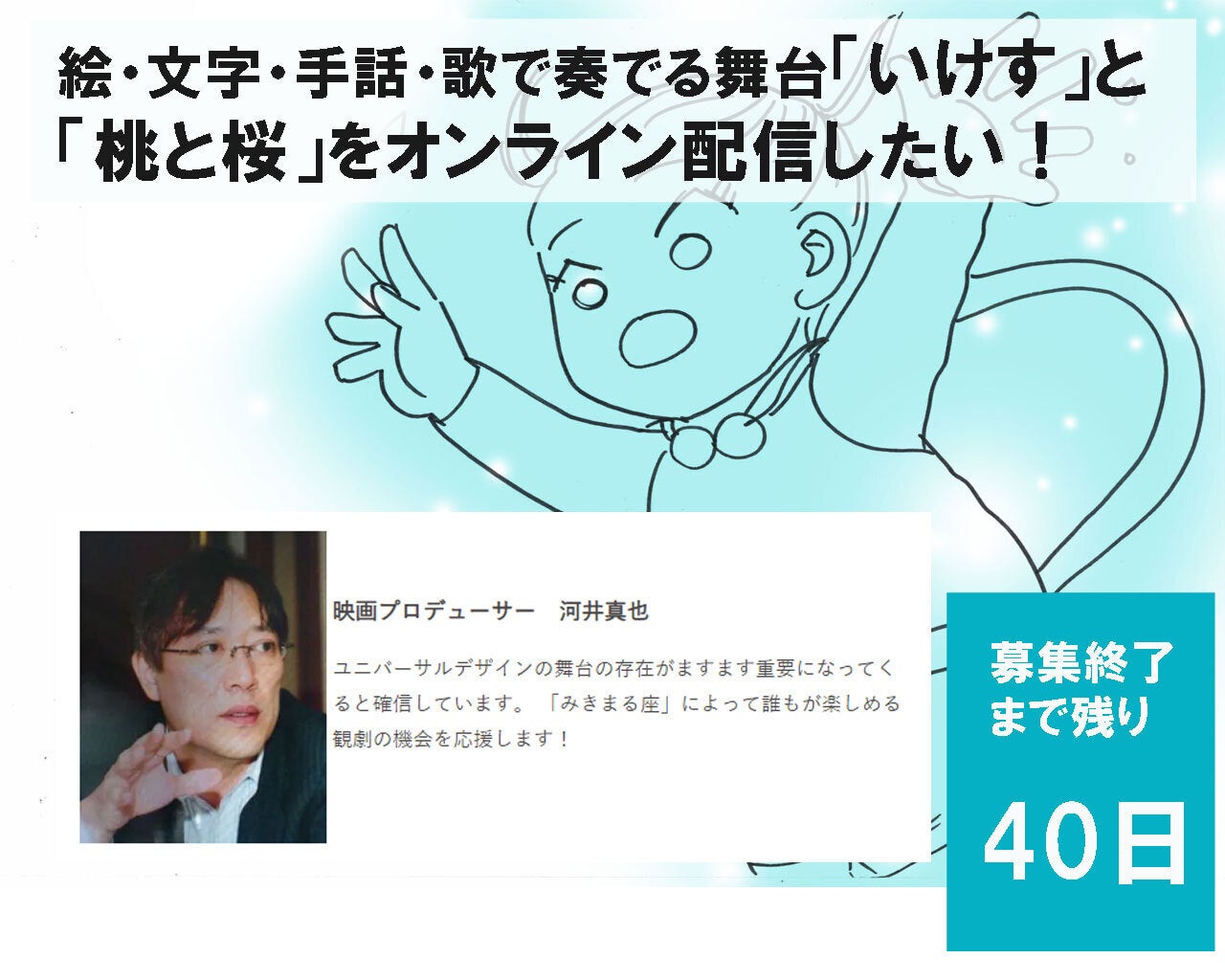 あと38日となりました。今日は父のことを少しお話ししたいと思います。世界の海を回る人だったので、家庭を顧みなかったひとでした。二年に1回しか帰ってこない人で、一緒に暮らしたこともない人でした。けれど、仲間に囲まれ、多くの人に愛された人でした。父が亡くなったときに多くの仲間が泣いたことか・・・・。思い出すのは父の海の匂いのする大きな手です。私はその手に抱えられて育ったんだなぁと。その大きな手のぬくもりそのものは探してもどこにもない。父は永遠の航海に出たまんま、帰ってこないだけ。そうやって私は父の死から触れないように生きてきました。3年前、母が亡くなったこともあり、同時に父のことを思い出すようになりました。今、思えば、私は母の前では父のことに触れないようにしていたのは私は母に気を使っていました。「父は父、母は母」と割り切っていました。二人とも、私の良き親であり、素晴らしい親でした。二人とも、障害を持って生まれた私のことを第一に考えてくれました。そんな二人の考え方は正反対でいずれも私のことを愛する気持ちから生まれたもの。そんな二人に「ありがとう」と讃えたくて、この作品をつくりました。「いけす」「桃と桜」この作品をオンライン演劇として残したい。ひとりでも多くの人に観て頂きたい。