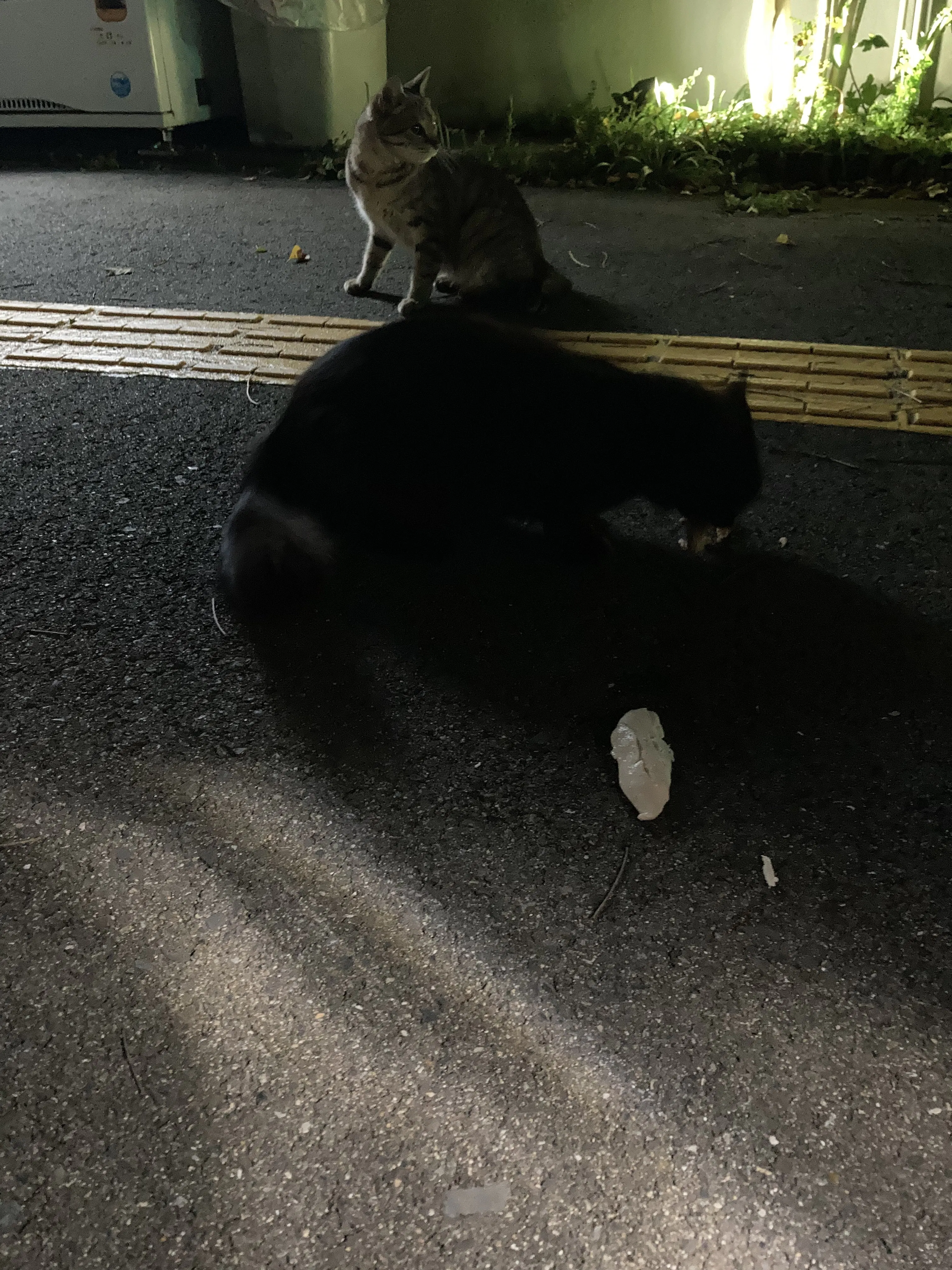 ロン毛黒猫さん、現れました。写真で分かりますがササミには見向きもしません。カツオを食べてます。二本食べてからササミを口にしました。だけど運びません。パウチは全く無視です。