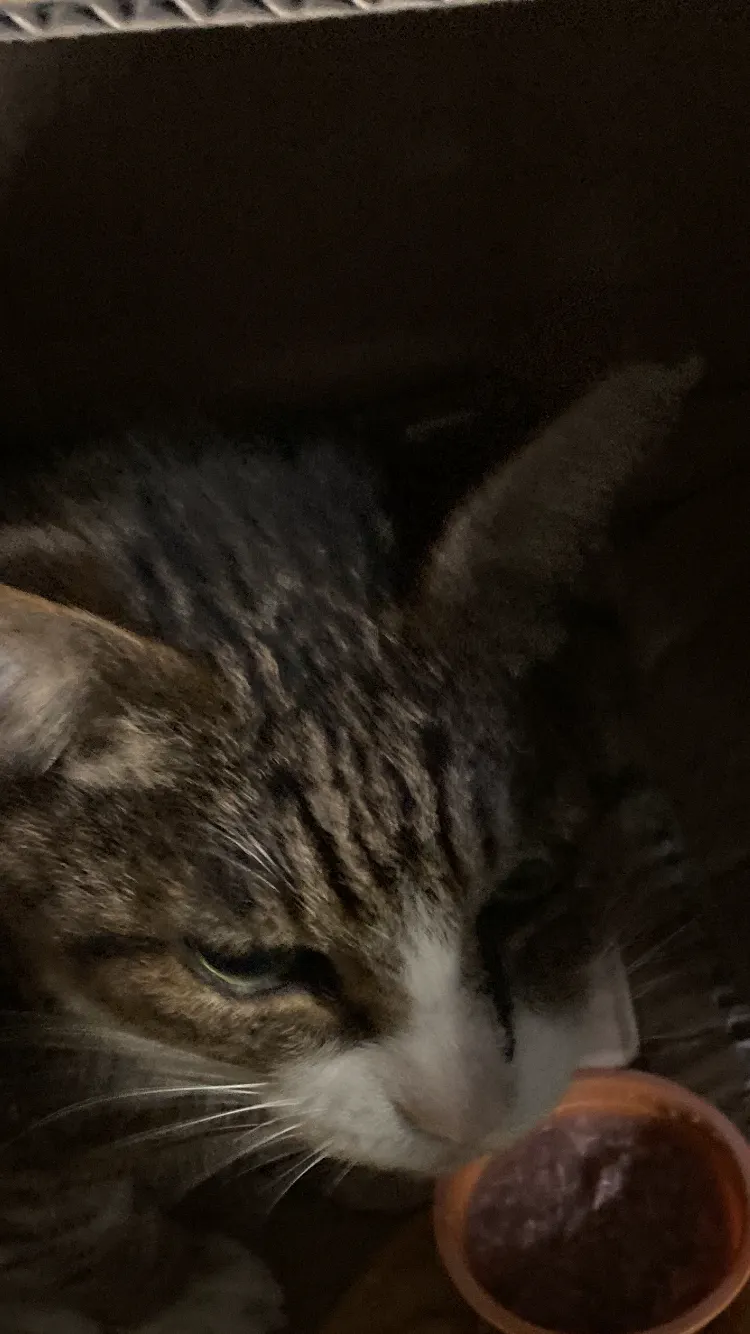 自宅事務所で暮らす自由猫のテル君。ステロイドと抗生物質の注射をしたけど今回は効き目がもう一つ、、段々と効かなくなってくるらしいからね。昨日はマグロを軽く茹でて与えました。それとオレンジカップ。オレンジカップは口が痛くない!と知ってる。良かった寝,いっぱい食べれる。