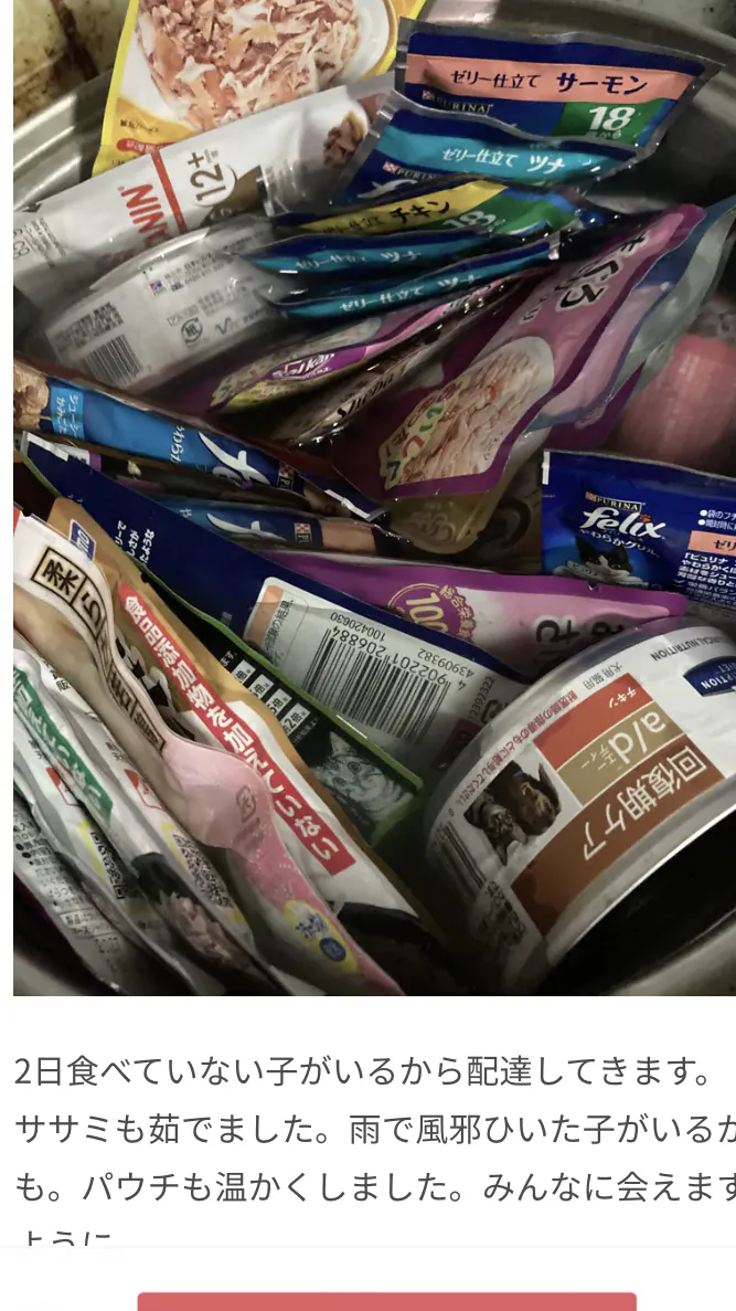 その子 その子に合ったフード お好きなパウチを届けてきます。1箇所、憂鬱な場所があります。一昨日、仁王立ちのオジサンが私を待っていました。時々、文句を言いにくる厄介な人、白い服を着て懐中電灯を手にしてるから、遠くからでも分かった。近づくのをやめました。猫達?姿を消してたのでしょう。オジサンの事を知ってるんですね。am12:20でした。先に他のエサ場に行き戻るとオジサンは居なかった。さぁみんな出ておいで!みんなにエサを与え、あの子を探しました。