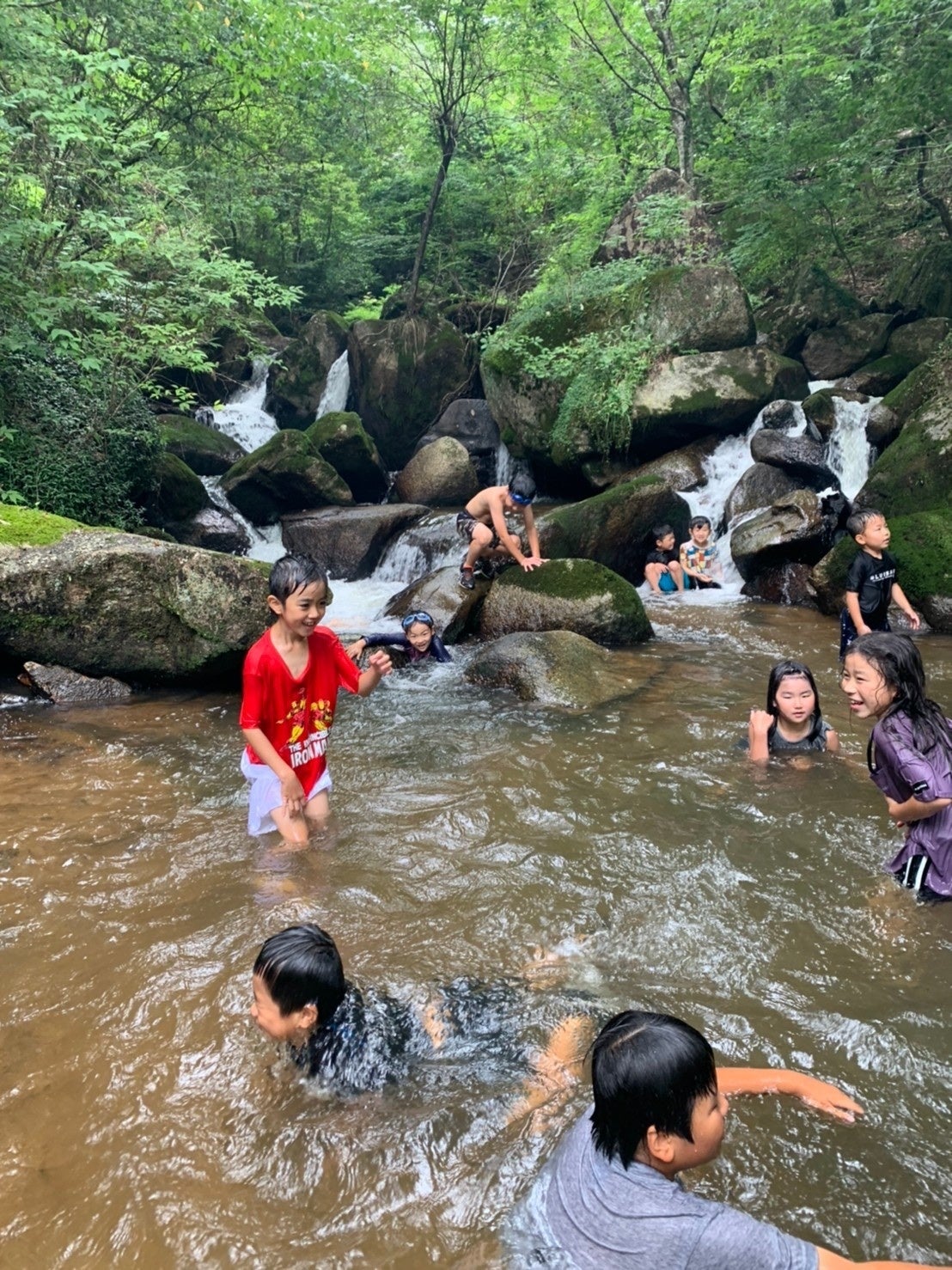 おにぎりを食べてからは下の滝まで降りて、全力で川遊び。帰りの山登り、指導員は足がガクガクでしたが、子どもたちはまだ遊びたい!と元気いっぱい。体力さすがです!