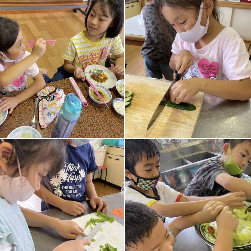 【切る】を任された女の子チームは丁寧に丁寧にきゅうりや、ハムを切っていきます。ボランティアで来てくださった、褒め上手の管理栄養士もっちゃんに沢山沢山褒められて、自信になったこと、間違いなし❤︎