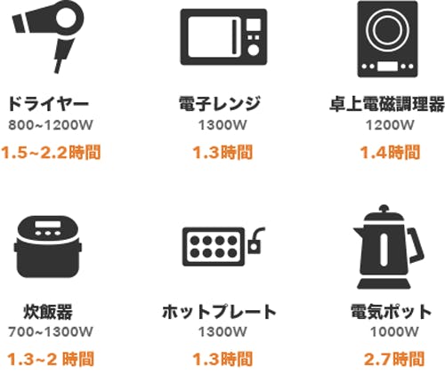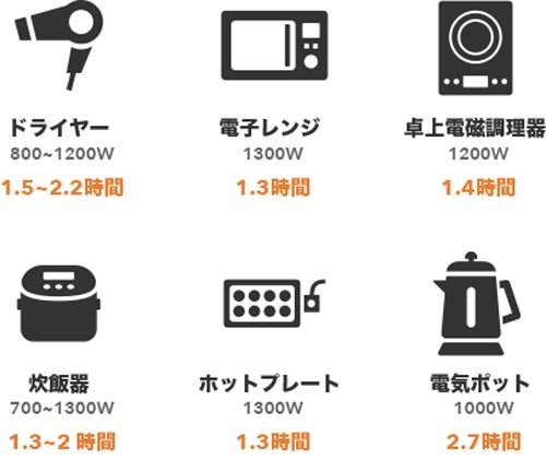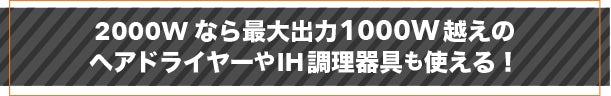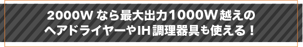 電子レンジ、電気ポット、IH調理器具、ドライヤーなど、1000W以上の電力を消費する家電をアウトドアで使えます。