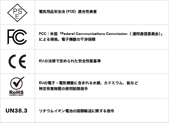 「MATERASポータブル電源」は各種認証を取得しています。
