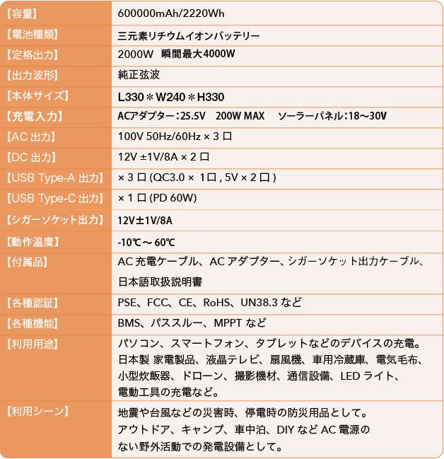 2220WHの容量があるので消費電力の高い電化製品でも長時間使用することが可能です。