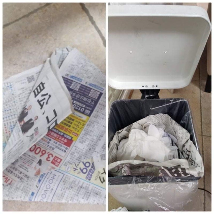 ビニール袋の上に紙カップ風に新聞紙をセットし、ゴミがたまったら新聞紙だけを取り出して指定ごみ袋に。そうすると、ビニール袋は半永久的に利用できます!