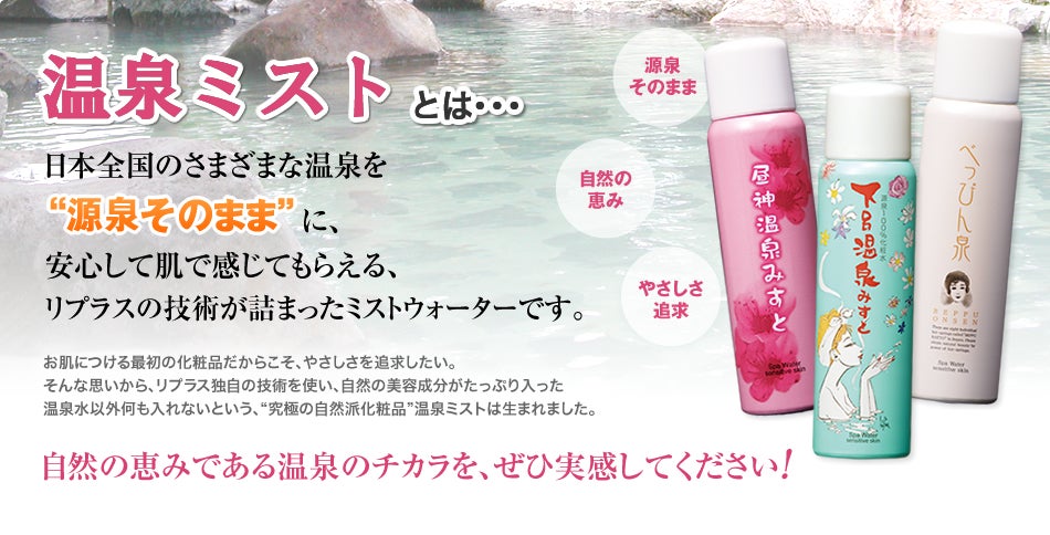 原料は原則温泉水のみ。防腐剤、保存料、化学成分を一切加えない「完全無添加の温泉水のみ」をボトルに詰めたミスト化粧水です。超微細なミストがお肌にうるおいを与えてくれます。何よりも全国の60を超える温泉地から発売され実績とお客様の評価を得ているからです。(千葉県はまだありません)