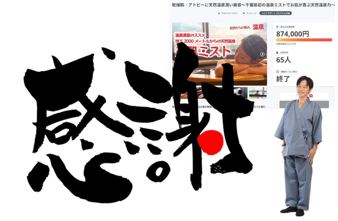 2021/09/09 17:27この度は亀山温泉ホテルの美肌温泉ミストのクラウドファンディングにご支援いただきまして誠にありがとうございます。1か月間のクラウドファンディング期間でございましたが、多くの方にご支援をいただき、合計65名の方から、874,000円もの御出資を賜りました。当初の目標金額は200,000円でした。おかげさまで初日に大幅に超える方にご支援をいただき何と初日達成という快挙でスタートしました。私自身コロナウィルス感染拡大の影響を大きく受ける観光業において、非常に前向きに気持ちが嬉しくなるプレゼントでございました。すぐに温泉ミストの手配を致しました。温泉ミストが完成するまでに検査等も含めて2か月以上かかります。温泉ミストの到着は今しばらくお待ちください。今回たくさんのリターンをご用意させていただきました。温泉ミスト以外のリターンに関してはすぐにでもお手元に必要な方もいらっしゃるかもしれません。温泉ミストの完成を待っていると遅くなってしまうので他のリターンに関しては準備が出来次第早急にお送りいたします。ぜひ楽しみにお待ちください。亀山温泉ホテルはこれからもたくさんのチャレンジを行います(現在5事業が水面下で進んでおります、こちらも楽しみにしていてください。)皆様にとって価値あるものを提供し続けていけるようにスタッフ一同努力しております。本日首都圏を中心に緊急事態宣言の延長が決定を致しました。まだまだ油断できない状況でございます。感染症予防対策を徹底しながら、少しでも気持ちが前向きになるようご自身でも気持ちを保ちながら、またみんなが心から笑いあえる世界にしていきましょう。参代目 鴇田英将 もっと見る