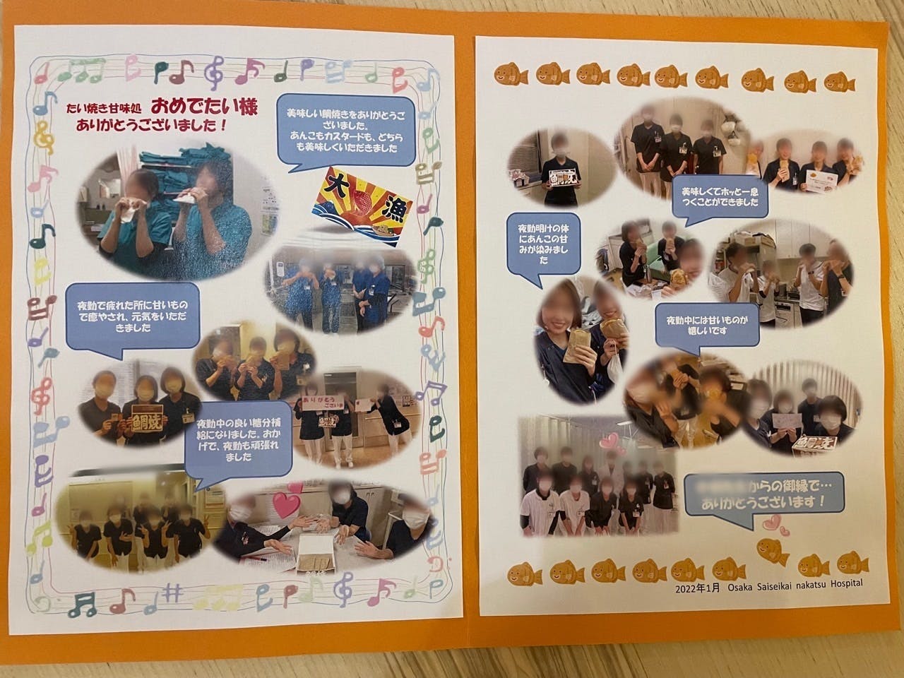 2022/01/31 10:12皆さまご支援ありがとうございます。たい焼きとマスクバンドを、済生会中津病院に届けてきました!1月19日 たい焼き48匹 マスクバンド24本1月26日 たい焼き83匹 マスクバンド39本そして、済生会中津病院へのお届け最終日に、看護士の皆様から、こんな素敵なメッセージの寄せ書きをいただきました♪皆さまからのご支援が、確実にスタッフの成長に繋がっていて、なおかつ医療従事者の方々にこんなにも喜んでいただくことができ、本当に感謝しかありません。この御恩を忘れず、これからも日々切磋琢磨して成長していきます。お届けは、残すところあと1回となりました。お届け完了しましたら、改めて活動報告させていただきます。 もっと見る