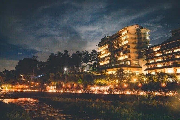 毎年8月14・15・16日に温泉街を中心に、「磯部温泉まつり」を開催しています。14日は鮎のつかみ取りと落語、15日は子どもみこしと「大花火大会」、16日は灯篭流しと仕掛け花火が行われます。