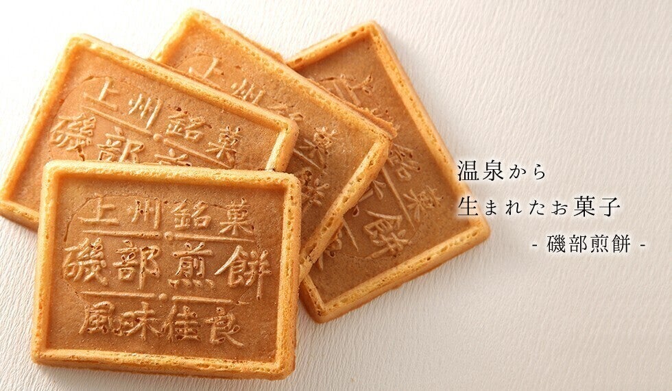 鉱泉を使った銘菓「磯部煎餅」。サクッとした瞬間、香ばしい香りとほのかに甘く、口溶け柔らかな、食べだしたら止まらないおいしさです。お土産にもぴったりです!磯部のお煎餅屋さんで使える1,000円分のチケットを郵送いたします。期間内に是非ご活用ください。