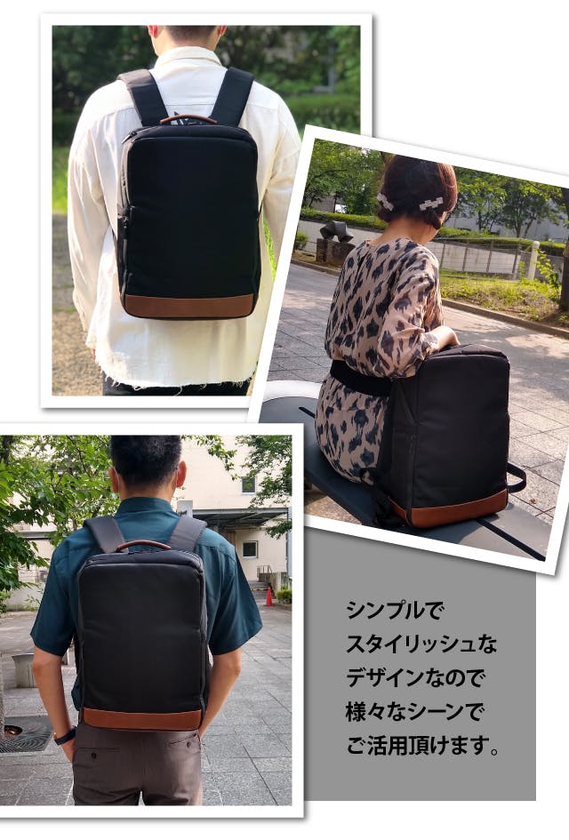 【UHIN2バックパック】の外観は余計な装飾のないシンプルなデザイン。統一感を損なわないようジップは全てブラックを採用。底面・取手にはキャメルブラウンの合皮をあしらい、異素材切替でメリハリを効かせています。