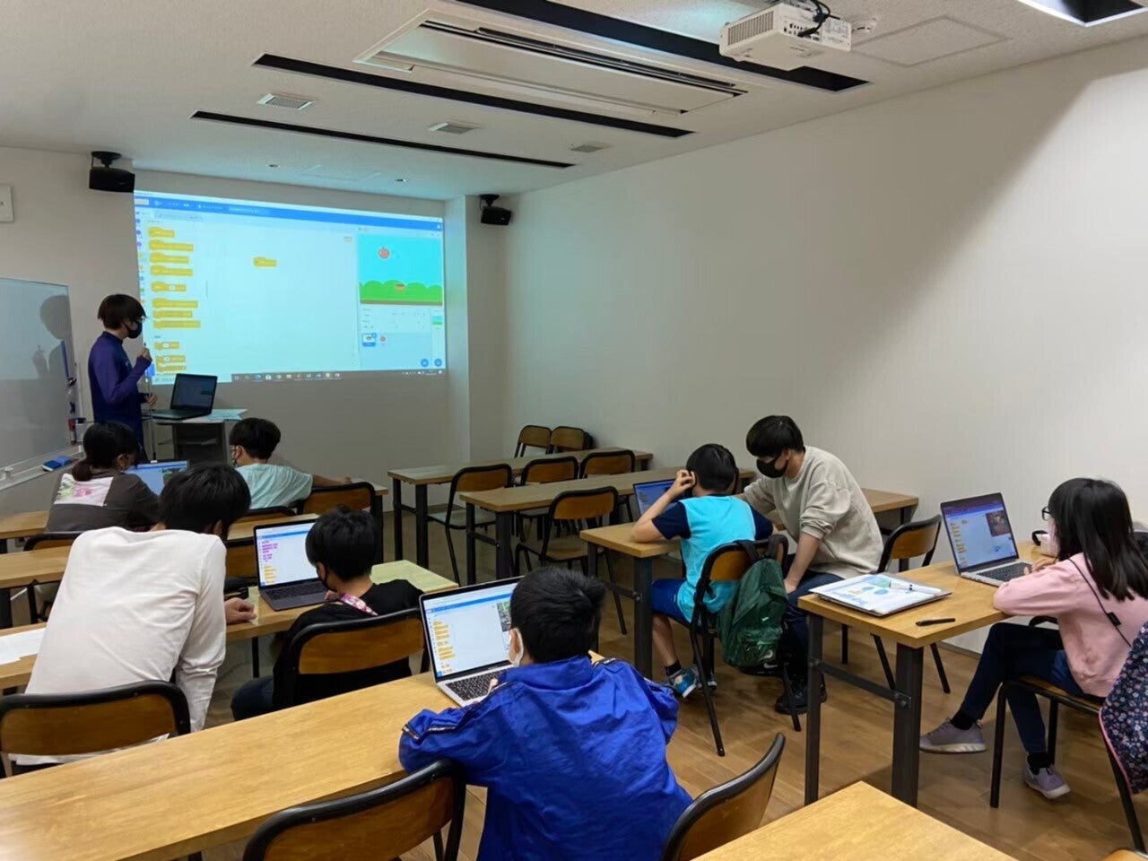 第一回目のイベントでは、スクラッチというプログラミング教材を利用して、りんごキャッチゲームを作成しました。X軸Y軸の考え方や、落ちる速度によるゲームバランスなど、少し難しい内容でしたが、高学年の児童ばかりだったので、難なく完成させていました!これからも不定期で開催する予定です。