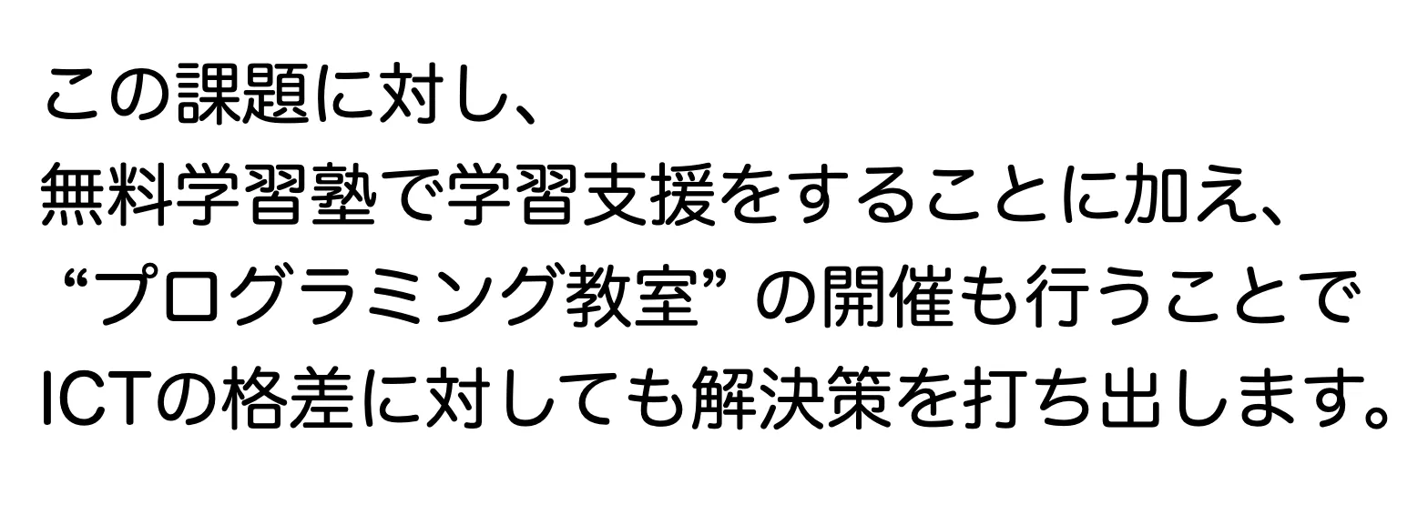 私たちはこの現状に対し、“極めてもったいない ”と感じ、「より多くの、伸ばせる子どもに対して学習できる場所・機会を与える」ということを目標に活動しています。