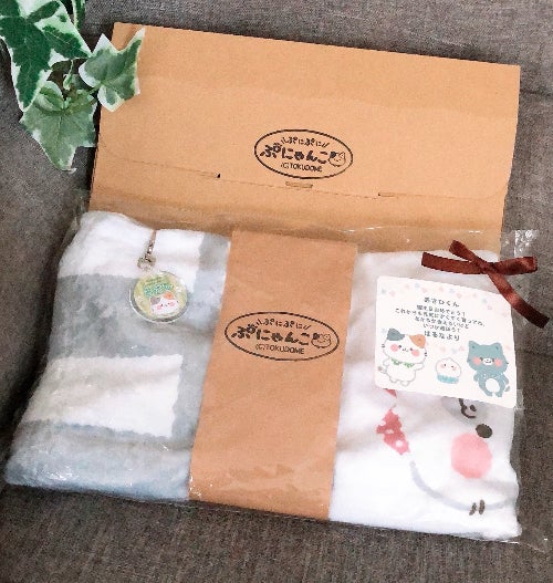 100,000円 お礼状・ポストカード5枚・はんかち1枚・名前入りはんかち・キーホルダー1個・シール2枚・ミニメガネ拭き1枚・名前入りブランケット1枚・名前なしブランケット1枚・コースター1個