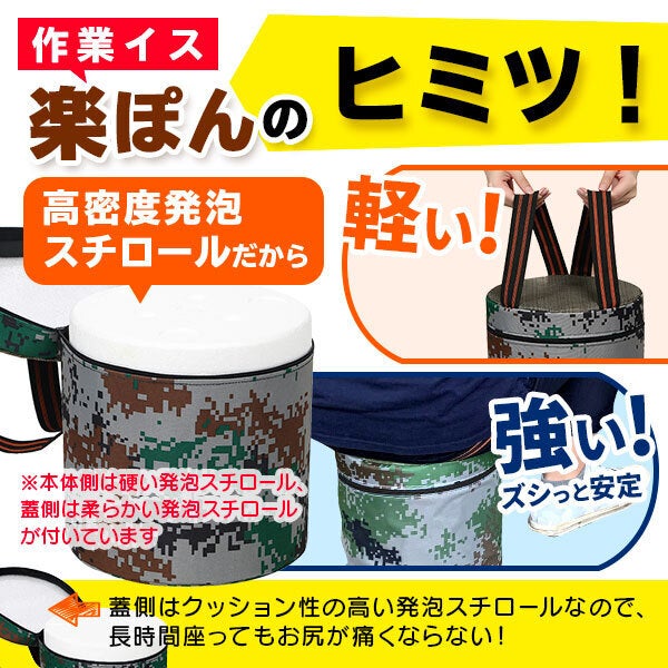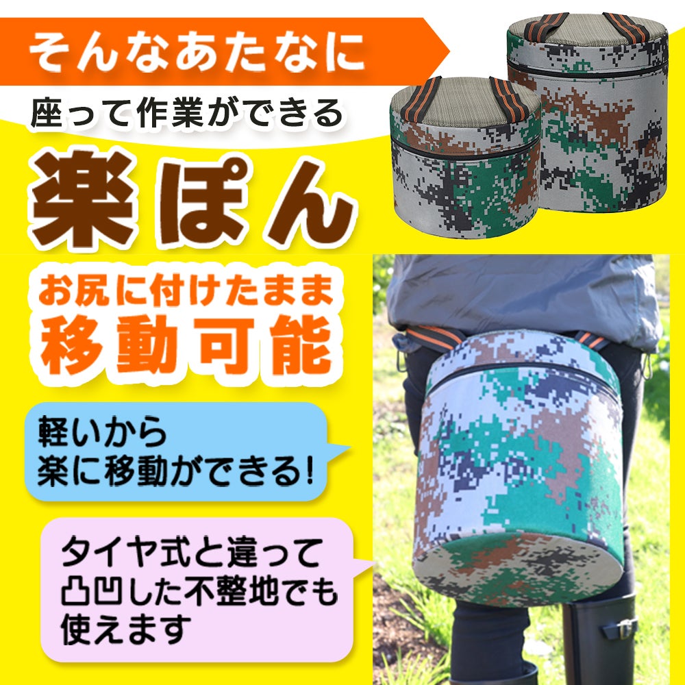 腰・膝に負担をかける農作業やガーデニング、バイク・車のチェーン交換、キャンプなどの野外作業での中腰作業は本当に辛いですよね。タイヤ付きの商品は畑や凸凹した場所では重くて移動が大変。でも楽ぽんならゴムでお尻に固定できるので、どこでも座れて移動も楽々!
