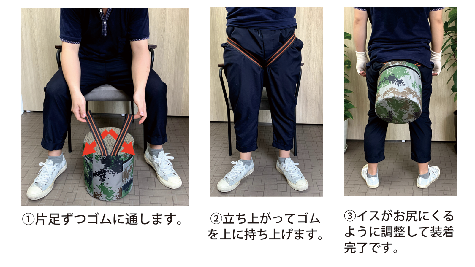 ※ 転ぶと危険ですので、必ず腰をかけ安定した状態で装着してください。