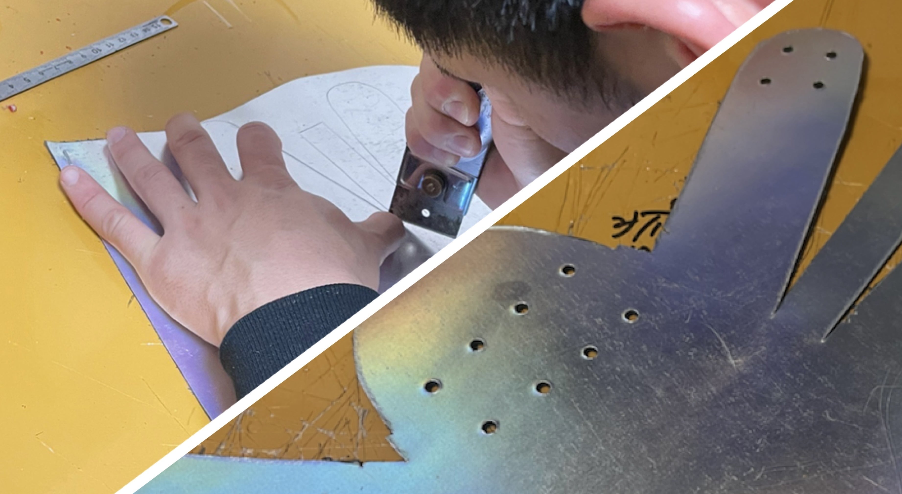 包丁を使った手裁断により一つ一つパーツを切り抜いており、仕上げに至るまで全ての作業を