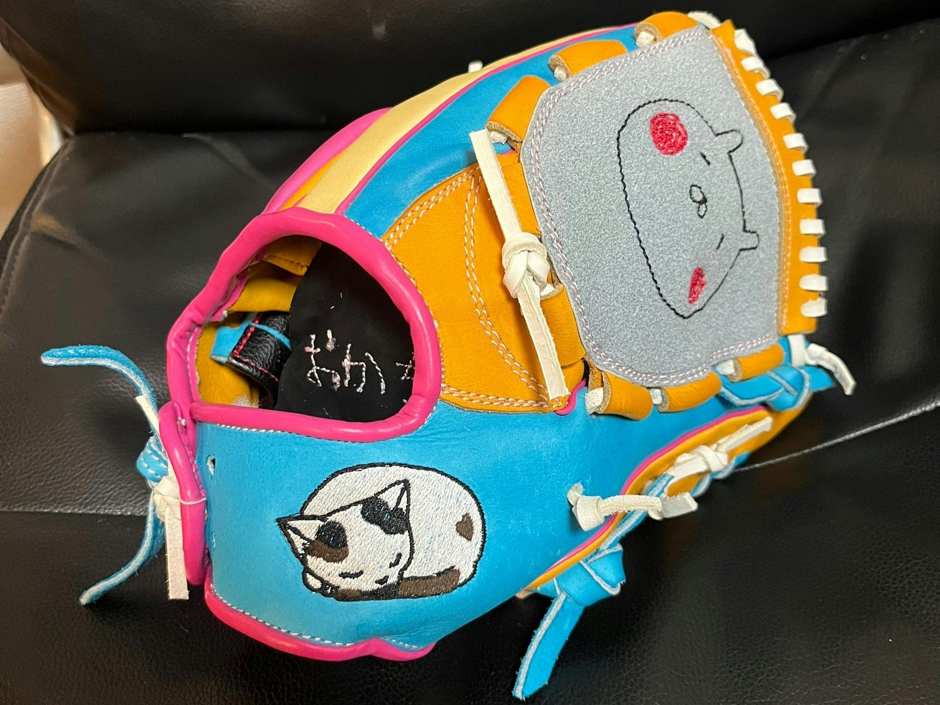 さまざまなカラーをふんだんに使った特製グローブ!こちら少年女子野球兼用モデルの手袋大きめという特別サイズになります。SkyCraftでは使用していただける方に合わせて採寸しフィットサイズのグローブを作成いたします。