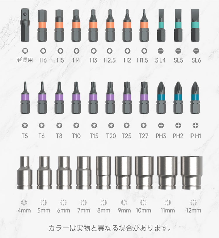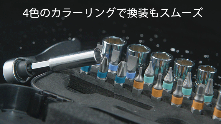 ビットは種類別にオレンジ、緑、紫、青と色分け、ソケットは銀色となります。どれも銀一色だった従来の市販品と違って、わざわざ取り出して先端を凝視しなくても区別できるので、換装も迷うことなくスムーズに行えます。