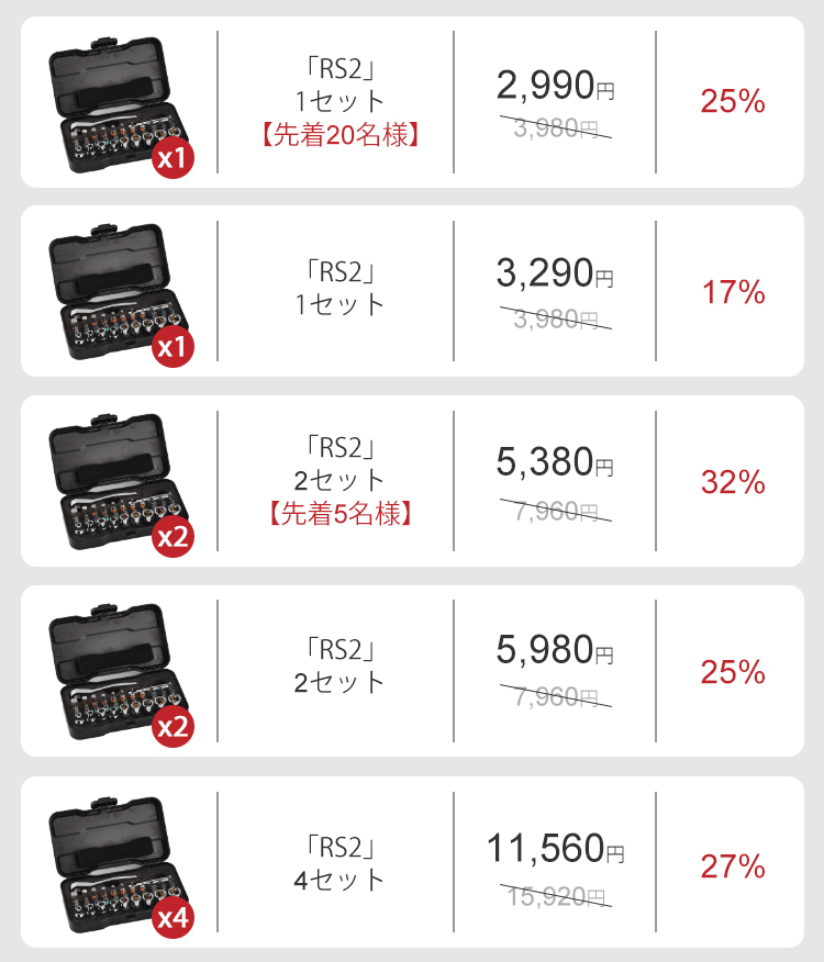 2021/08/02 10:12unsyuでございます。この度は33in1ラチェットドライバー「RS2」 へのご支援、誠にありがとうございました(*^^*)本プロジェクトは7/30(金)、74名様より251,210円のご支援を賜り終了いたしました!商品発送は予定通り9月末までの発送を予定しております。皆さまのご期待にお応えできる製品をお届けできますよう精一杯努めてまいります。発送まで今しばらくお待ちくださいませ。引き続き、unsyuをよろしくお願いいたしますm(__)m もっと見る新プロジェクトSTART!
