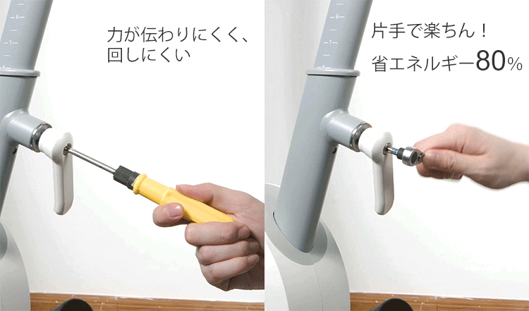 ネジ回しの際の回転ロスが小さく、作業中の負担が軽減。通常のドライバー使用時と比べて省エネルギー80%(※メーカー試算)を実現しました。