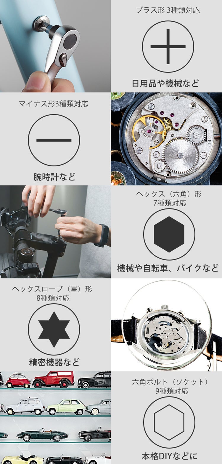 機械の組み立て、自転車のメンテナンス、腕時計の調整などにも対応する、プロ仕様のアタッチメントも。