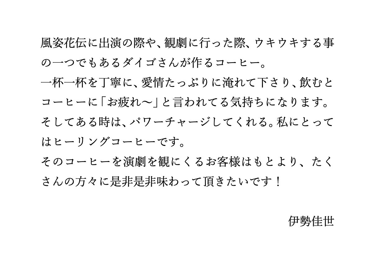 風姿花伝に出演の際や、観劇に行った際、ウキウキする事の一つでもあるダイゴさんが作るコーヒー。一杯一杯を丁寧に、愛情たっぷりに淹れて下さり、飲むとコーヒーに「お疲れ〜」と言われてる気持ちになります。そしてある時は、パワーチャージしてくれる。私にとってはヒーリングコーヒーです。