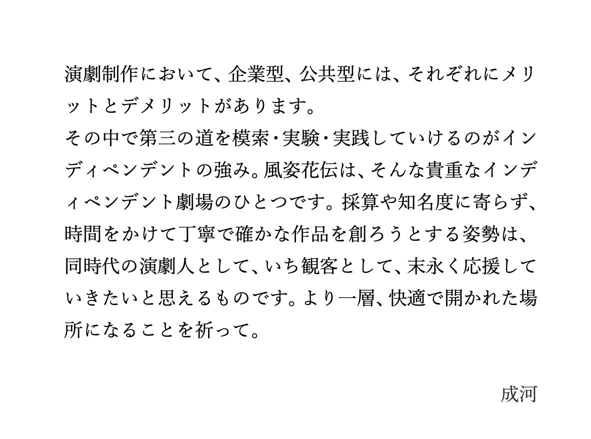 その中で第三の道を模索・実験・実践していけるのがインディペンデントの強み。風姿花伝は、そんな貴重なインディペンデント劇場のひとつです。採算や知名度に寄らず、時間をかけて丁寧で確かな作品を創ろうとする姿勢は、同時代の演劇人として、いち観客として、末永く応援していきたいと思えるものです。より一層、快適で開かれた場所になることを祈って。