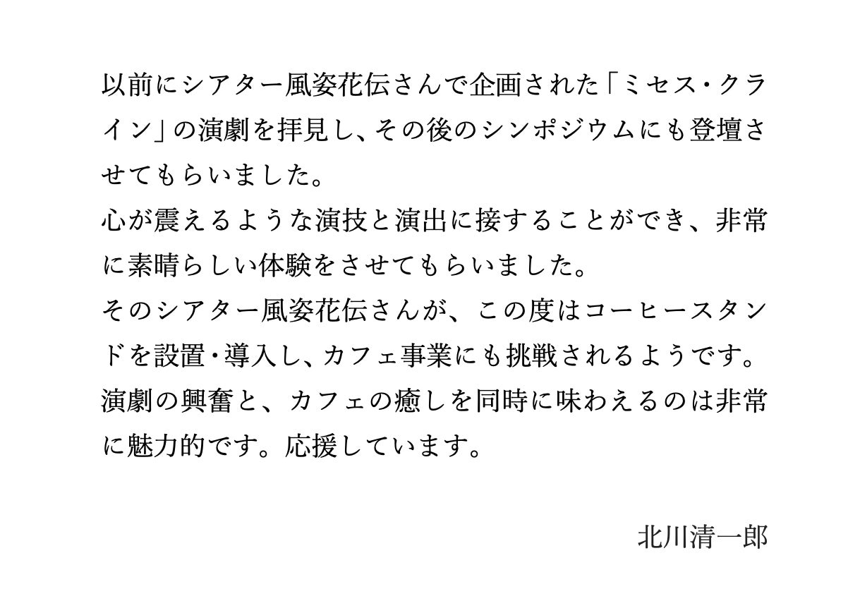 心が震えるような演技と演出に接することができ、非常に素晴らしい体験をさせてもらいました。そのシアター風姿花伝さんが、この度はコーヒースタンドを設置・導入し、カフェ事業にも挑戦されるようです。演劇の興奮と、カフェの癒しを同時に味わえるのは非常に魅力的です。応援しています。