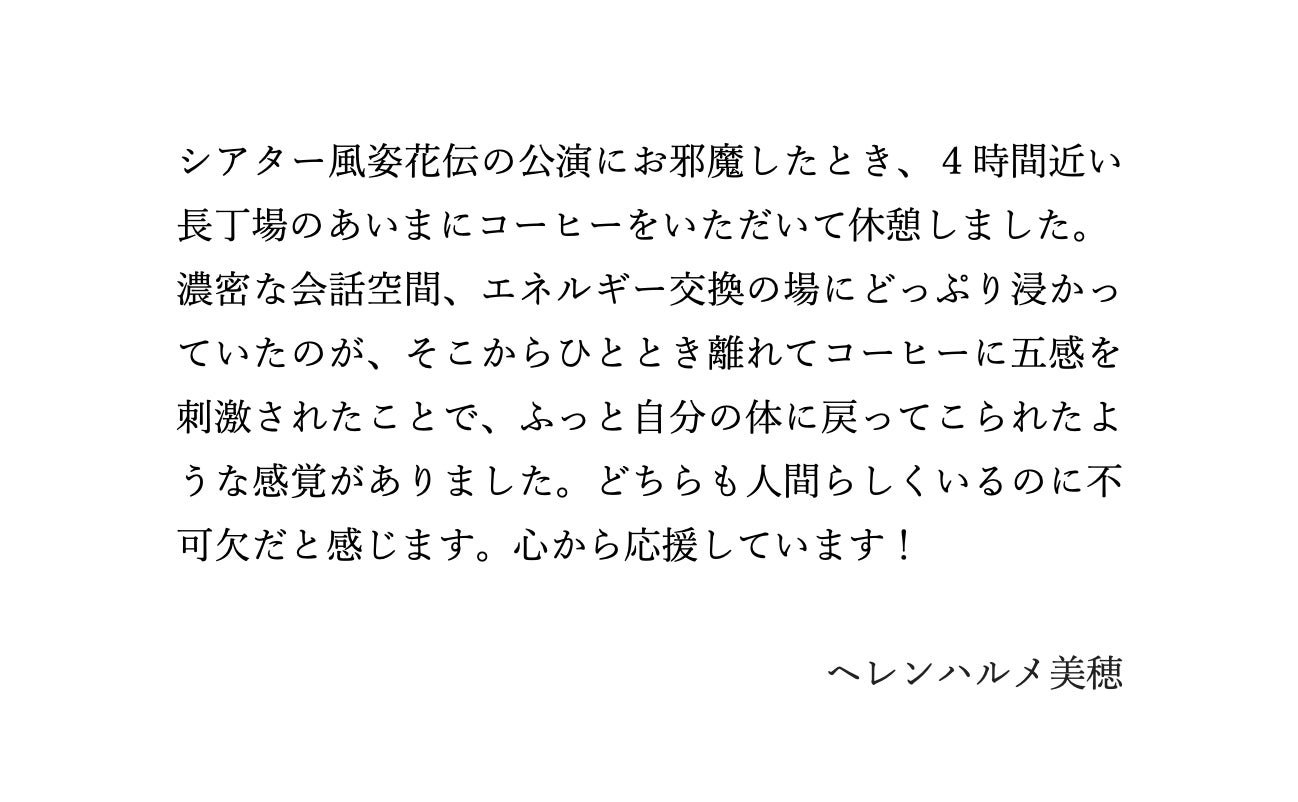 風姿花伝プロデュースvol.6「終夜」で 翻訳をしていただいた翻訳家のヘレンハルメ美穂さんに応援メッセージをいただきました。